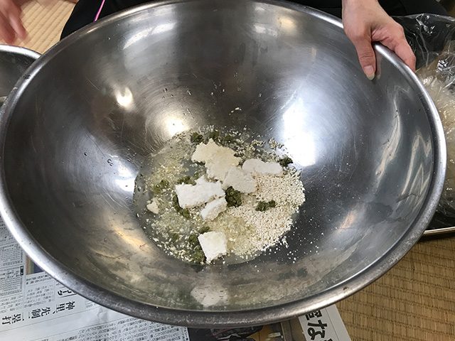 神人(かみんちゅ)の皆さんが麹や米などの材料を少しずつ持ち寄り、それを合わせてアマガシが作られます。昔はこの時に使う麹は手作りでしたが、現在は市販の麹が使用されています。