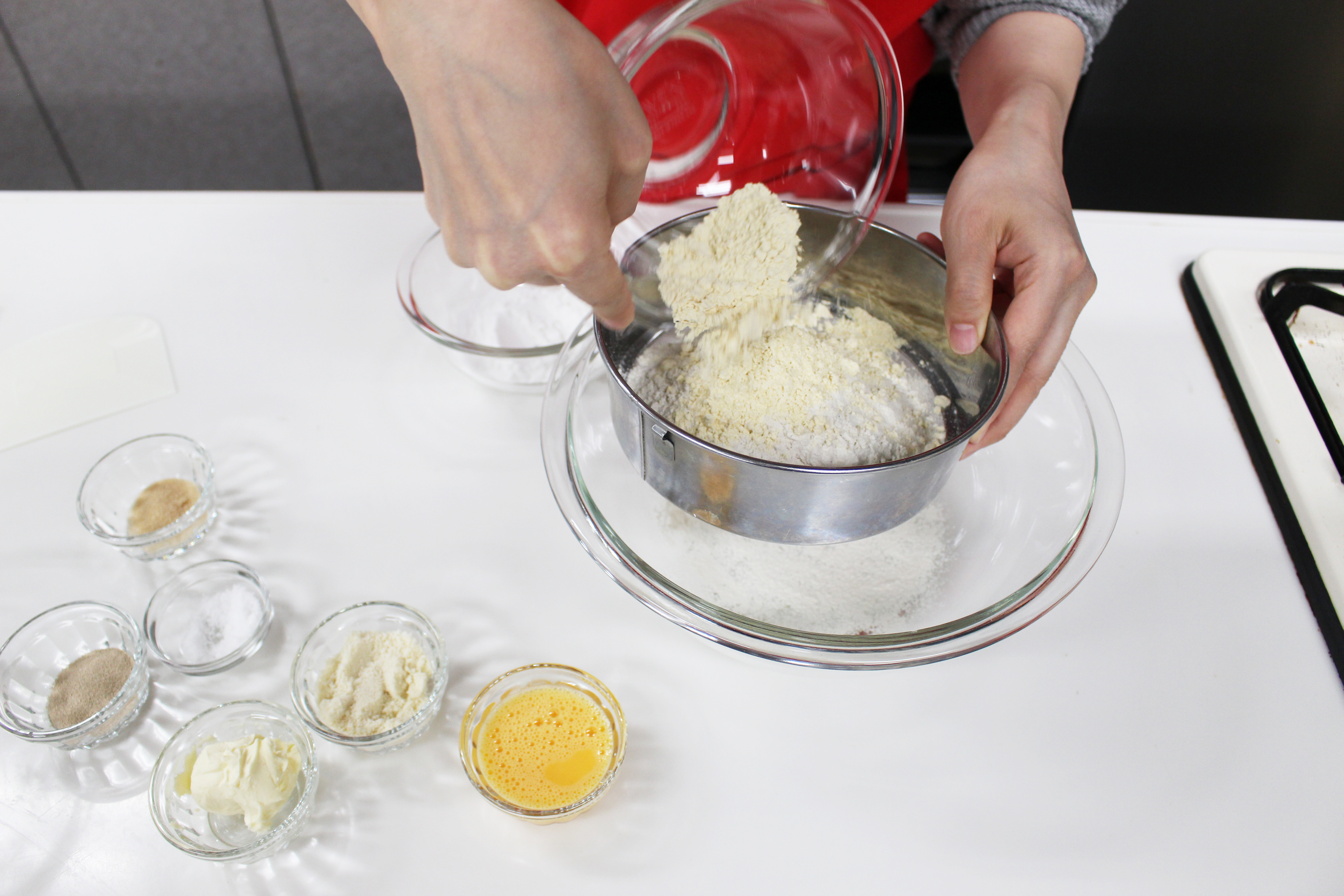 ドライイースト、グルテン粉などの材料をふるい、卵と豆乳を入れ、混ぜていきます。