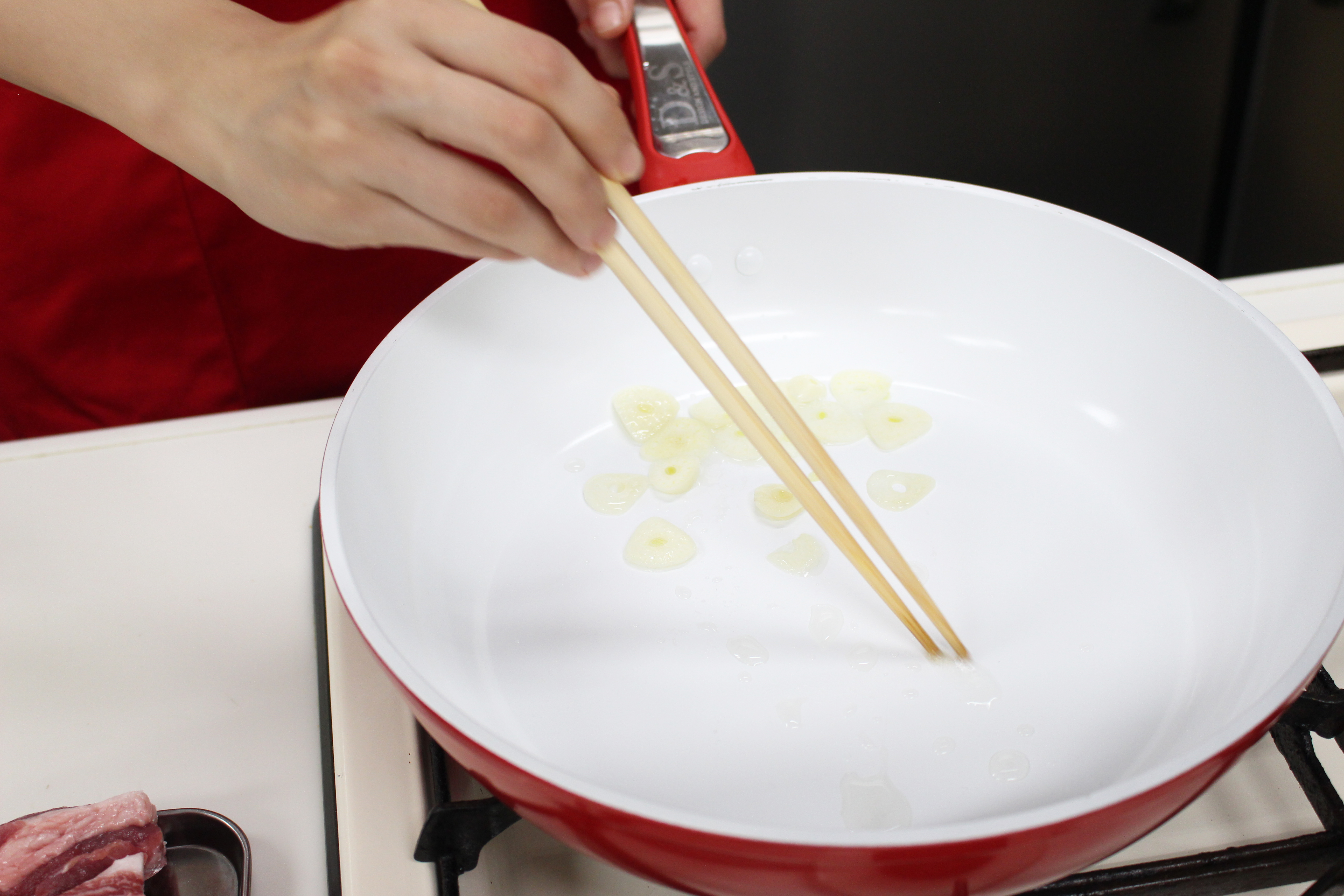 そして鍋にサラダ油、薄切りにしたにんにくを熱し、