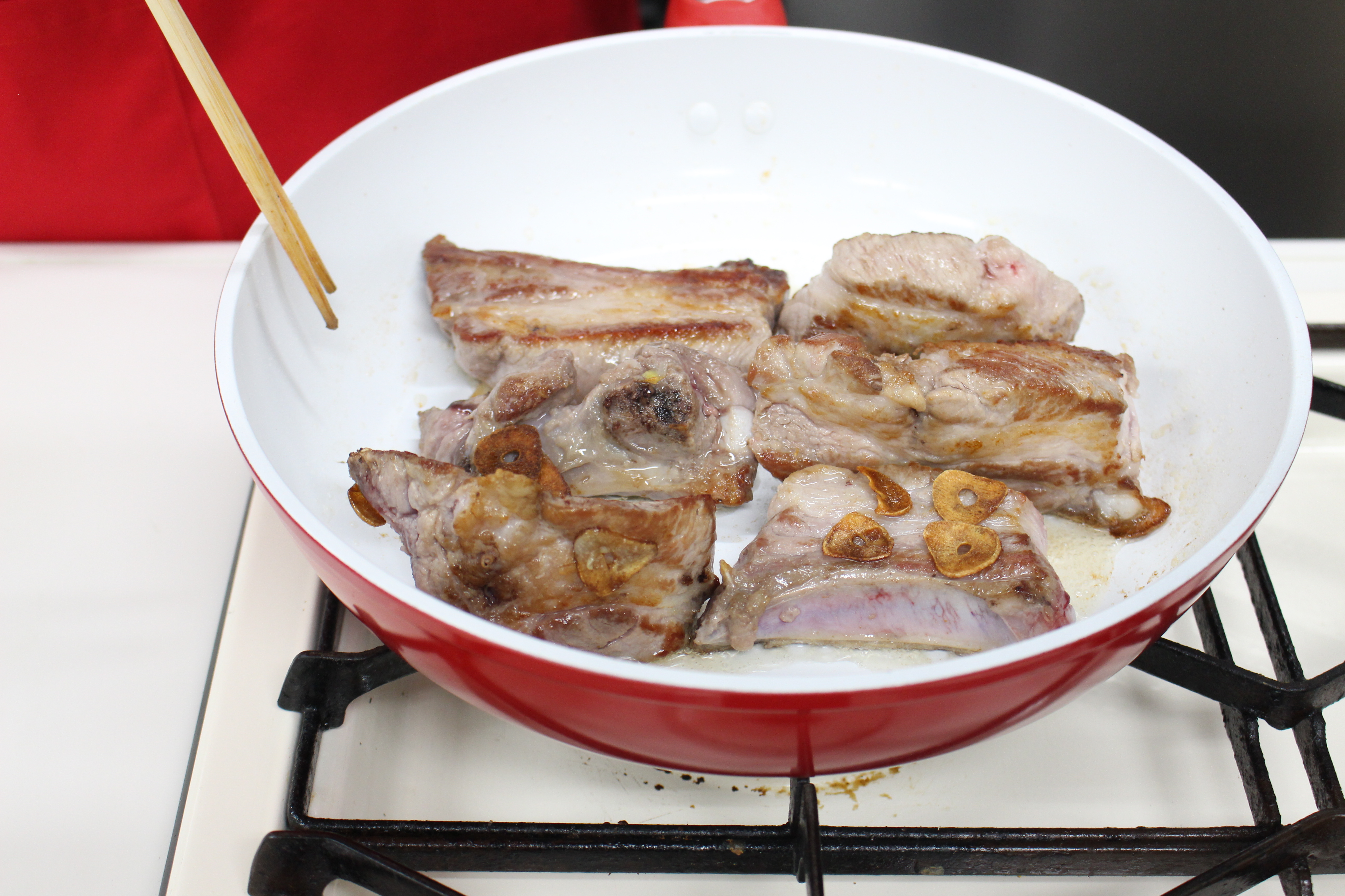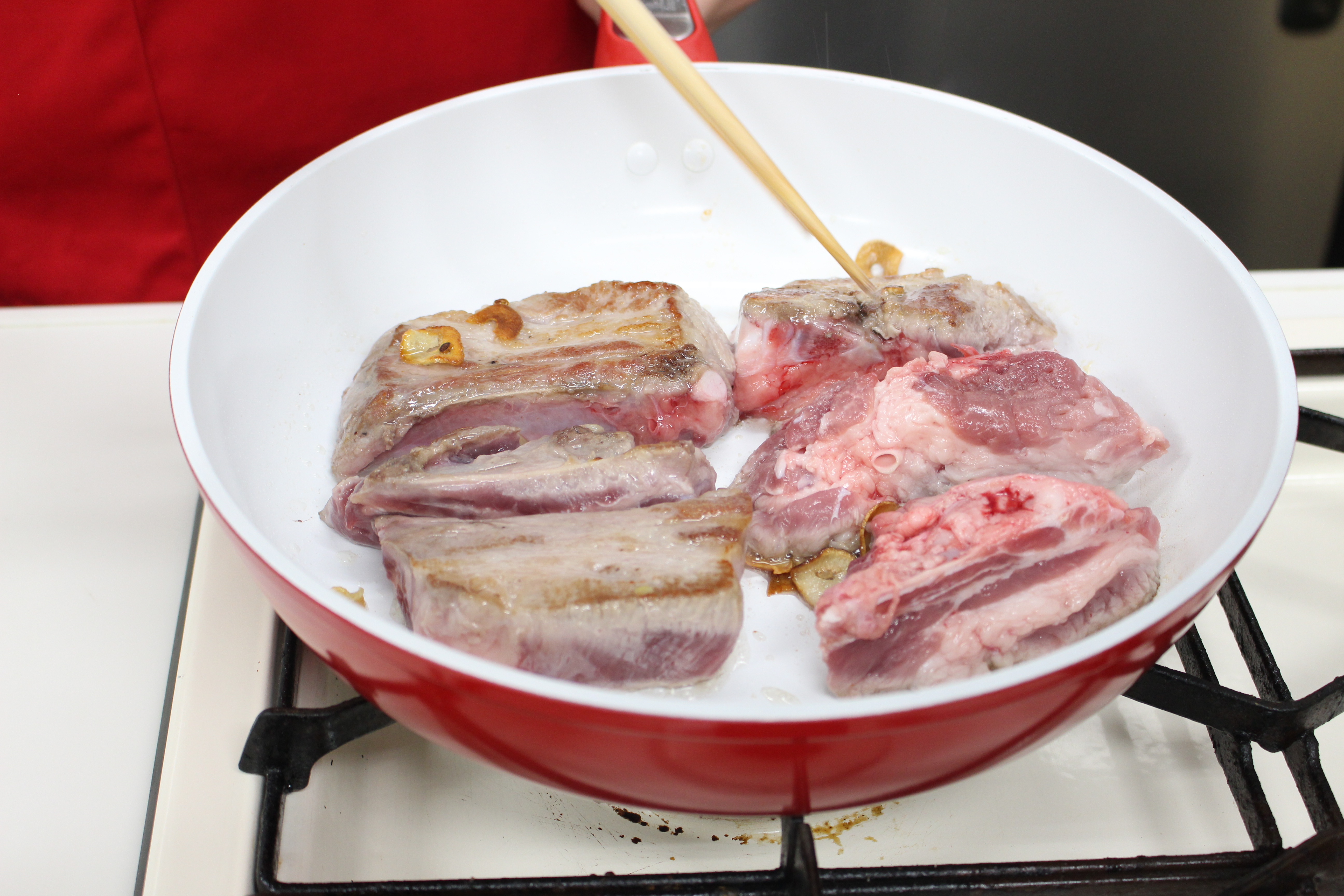 スペアリブを加え、焼き色をつけます。