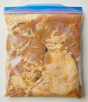 Cut the chicken thigh into half. Put the chicken in a zipped bag and add Koji Amazake. Rub well by hand.