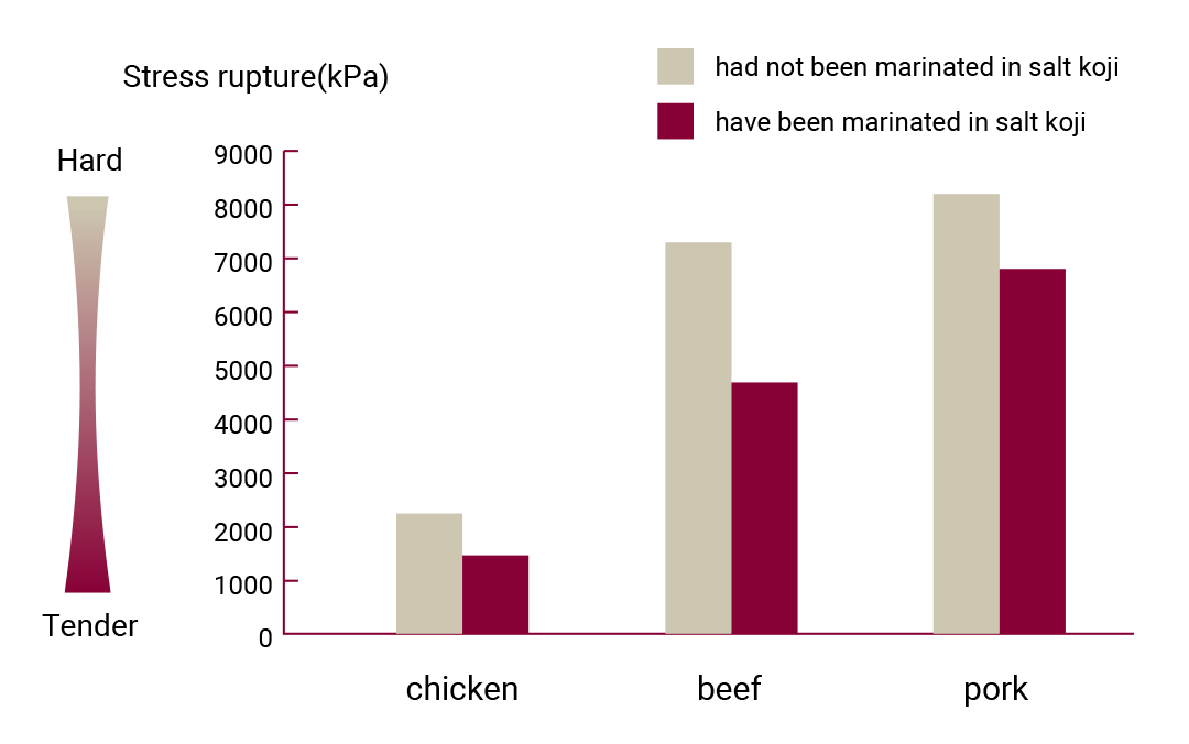 Compared to meat that had not been marinated in salt koji, the pressure required to cut the chicken and beef was 38% less, and 18% less for pork.