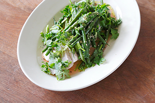 【4】[3]に香菜、ごまを散らし、よく混ぜ合わせた[a]をかける。好みで、粗挽黒こしょうを振る。