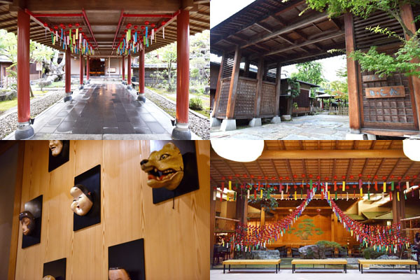 文化の発信地でありたいとつくった能舞台。『紫宸殿の宴』では毎晩、和太鼓、三味線、尺八、舞などの地元信州の伝統芸能の演者が公演を行っています。ちなみに、結崎・坂戸・外山(とび)・円満井と4つのお部屋タイプに分かれる、石苔亭の19の部屋の名前はすべて狂言の演目から取られています。