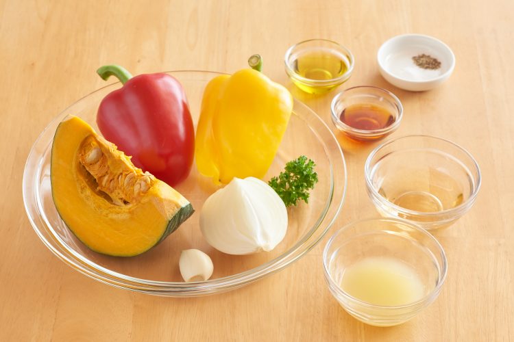 野菜の中でもビタミンCの含有量が最も高いパプリカと、ビタミンAとEを豊富に含むカボチャを使ったマリネ。