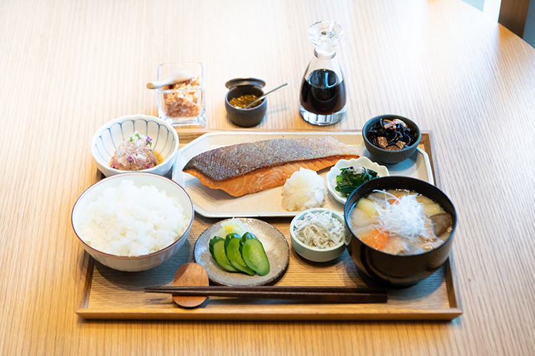 メニューは、「厚切り銀鮭の塩焼き」をメインに、おかわり無料の「炊き立てのごはん」、「白味噌のとん汁」、魚を醤油ダレに漬け込んだ大分の郷土料理「りゅうきゅう」、柚子と花椒が香る「ぬかづけ」、ふっくら炊き上がった「しらすの釜揚げ」、梅で味付けした「ほうれん草のおひたし」、具沢山の「ひじきの煮物」という、男性でも満足感のあるボリューム。実際に出勤前に立ち寄る、ビジネスマンも多いのだとか。