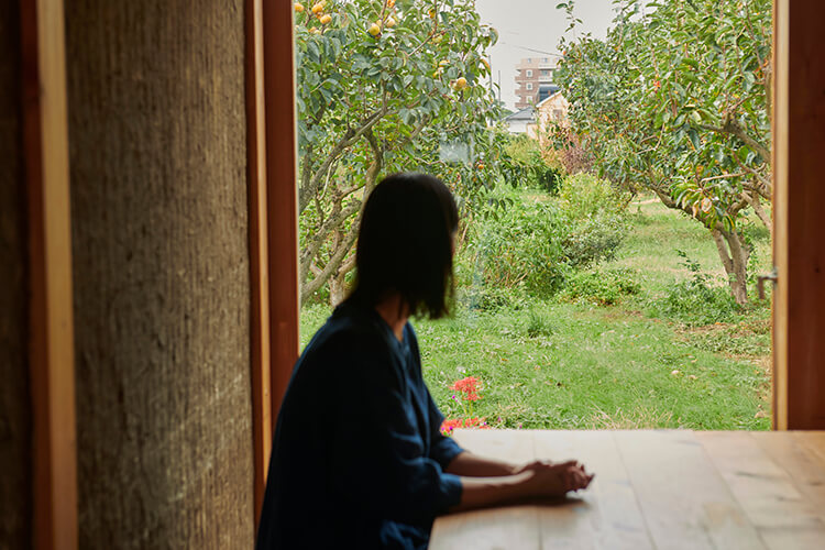 熊澤家の畑は、季節ごとにさまざまな野菜や果物が実ります。私たちが訪れたのは、ちょうど栗のイガが弾け、赤いザクロが実をつける頃でした。秋風が吹くのが通年よりも遅い今年ですが、徐々に柿の実も鮮やかに色づき始めています。