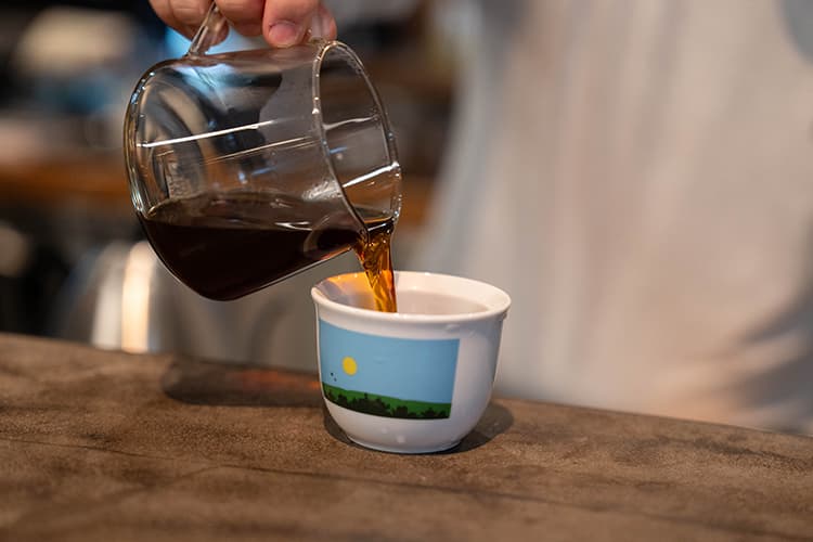 赤川さん自ら、サンプルローストをドリップ。フルーティーな柑橘の香りと、飲み終わった後の爽やかな甘みが印象的。