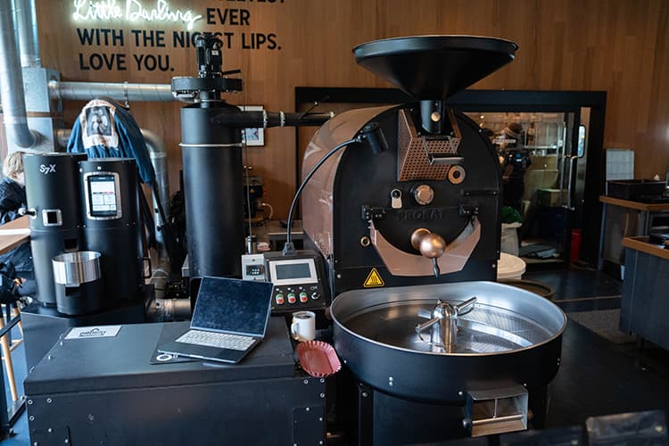 焙煎機はドイツの老舗・プロバット社製。店内の一角に設置され、焙煎の音や香りが空間に心地よく広がる。