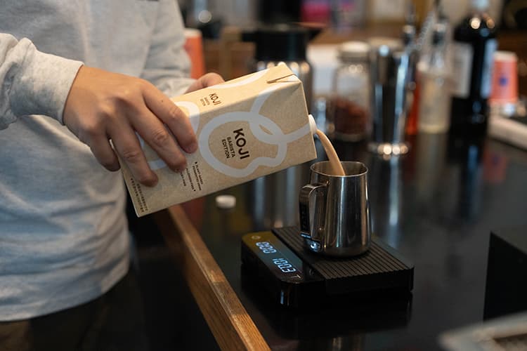 「開発にも携わらせていただいたんですが、最初に飲んだとき、米糀由来の自然な甘みと香りに驚きました。ほかの植物性ミルクでは分離しやすいものも多いなかで、米糀ミルクは牛乳のように扱いやすく、コーヒーの風味を引き立ててくれるんです。それにアレルギーの心配がないのも大きな特徴ですね」