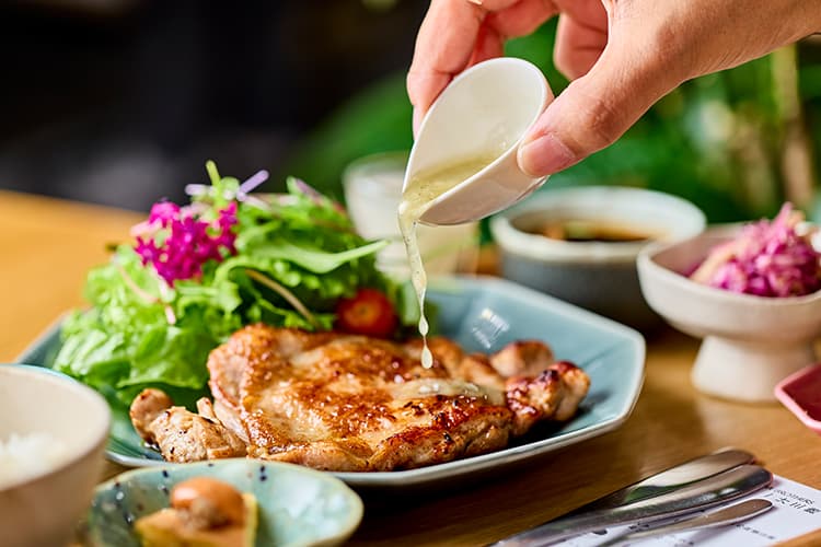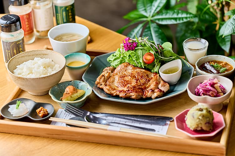 お店で展開する料理のコンセプトは“ちょっと体にいいごはん”。メイン食材はもちろん、小鉢やサラダのドレッシング、ソースにいたるまで、麹を使ったメニューを提供しつつ、こだわりすぎず、無理なく続けられる“ちょうどいい”メニューが並びます。