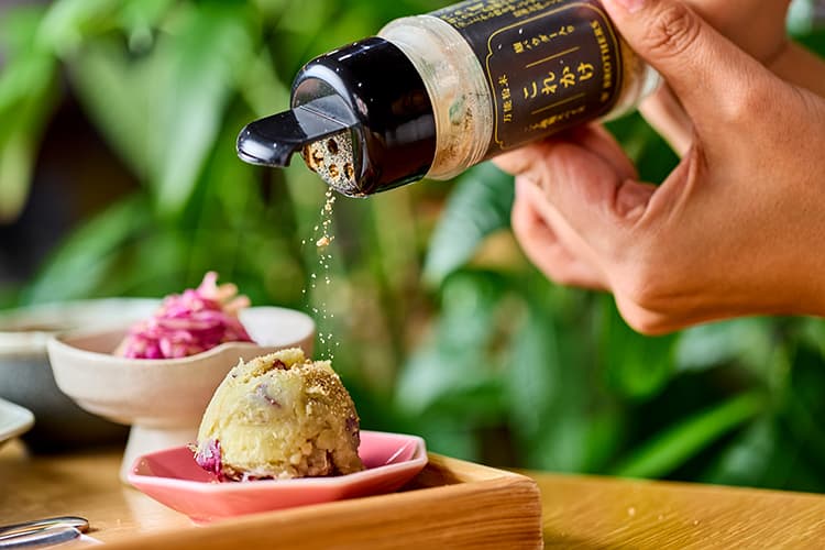 「いまお店で販売しているのは、万能粉末の『麹パウダー入り これかけスパイス』。プレーンやカレー、チリ味のほかに、期間限定のフレーバーも展開しています。今日のメニューだと、サツマイモサラダにお好みのスパイスを振りかけて食べるのをオススメしています。『減塩“旨塩麹”』は生の米麹、塩、水のみで作った低温発酵・非加熱の調味料。酵素がたっぷり含まれているだけでなく、市販のものより塩分が控えめなので、漬け込んだお肉をそのまま焼いても焦げにくいんです。メインの肉や魚だけでなく、ドレッシングにも使えます。ほかにもスムージーや『万能麹“醤油麹”』や『生“甘麹”』など、オリジナルの調味料の開発にも力を入れています」