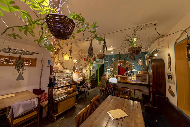 「カフェ ココハネ ベジと発酵ごはん」の店内に一歩足を踏み入れると、グリーンやドライフラワー、地元で集めた流木などが飾られ、柔らかな雰囲気が漂います。店がオープンしたのは2019年5月。実は店主の永谷さんは飲食店での勤務や料理人としての経験はゼロ。意外な経歴の持ち主でした。