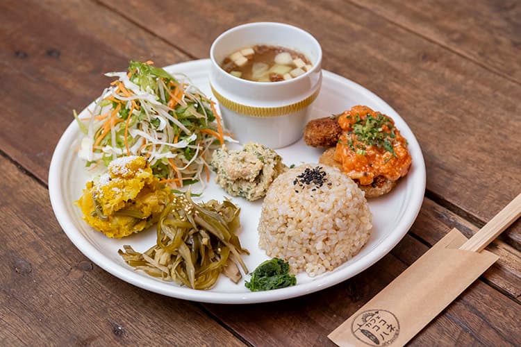「例えば、メインとなるコロッケにはいろんなお豆を使っていて、酒粕とトマトを使ったソースをかけています。副菜にはベジミートを使った料理や、茎わかめ、ひじき、キノコなど食物繊維やミネラルもしっかりと採れる一品にして栄養バランスを意識しています。ドレッシングには手づくり梅干しの梅酢や、タマネギを乳酸発酵させたもの、アチャールを使っています。汁物はみそ汁のほか、夏はポタージュ、冬はシチューにするなど、飽きのこないメニューを心がけています。ハンバーガーに使うバンズも天然酵母を使った自家製のもの。新月の時には世界中のソウルフードをアレンジした麺料理を出したり、試行錯誤しながらメニューを考案しています」