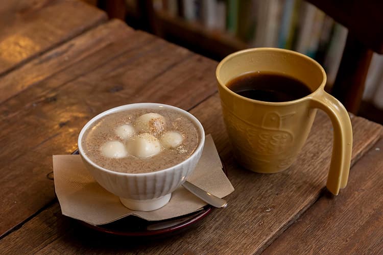 カフェメニューはパウンドケーキやシナモンロールのほか、インドやネパールでよく使われる、珍しいシコクビエを使ったぜんざいなど。フェアトレードのコーヒー豆を自家焙煎したコーヒーともよく合います。