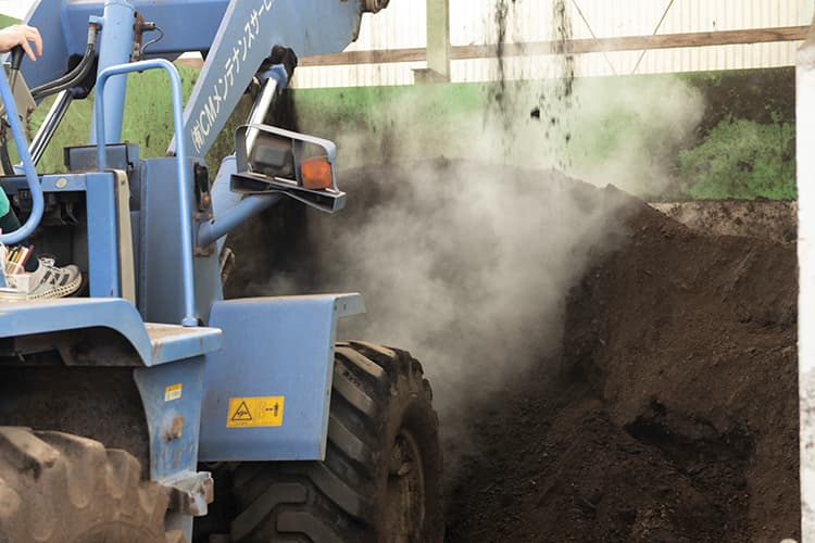 「堆肥の原料には、豆腐のおから、ビールの製造過程で生まれる麦芽かす、コーヒーかす、米ぬか、カキ殻、竹パウダー、規格外のマッシュルームなど、多彩な副産物を使っています。どれも通常なら廃棄されてしまうものばかり。けれども、食の現場から出る副産物を土に戻せば、また作物が育ち、それが再び食卓に戻ってくる。これが自然の循環です」