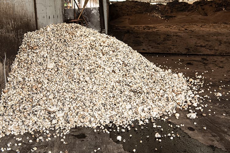 左 規格外となったマッシュルームが堆肥の原料に。発酵の始まりは、この真っ白な状態から。