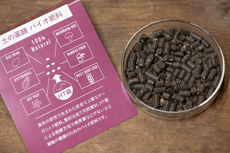 右 長年の研究で生まれたオーガニック肥料「土の薬膳」。