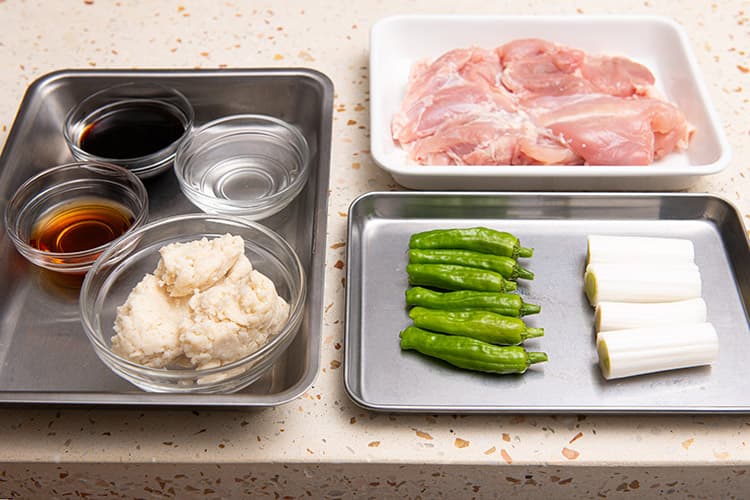 「鶏肉のしょうゆみりん酒粕漬け」のつけ合わせに、長ねぎは長さ4等分、ししとうはへたを短く切っておく。