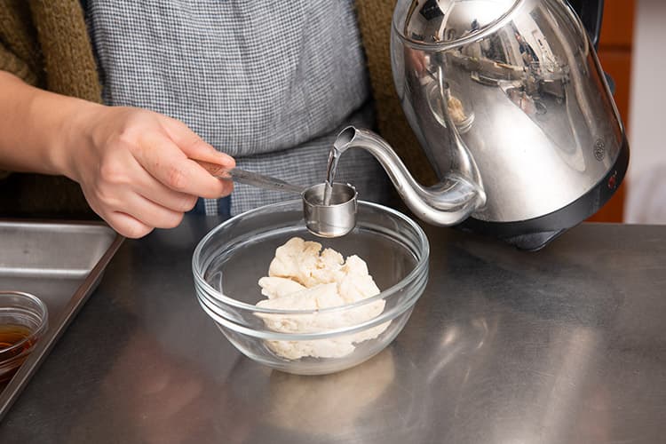 熱湯を加えて溶かしながらよく混ぜていくと、ペースト状に。