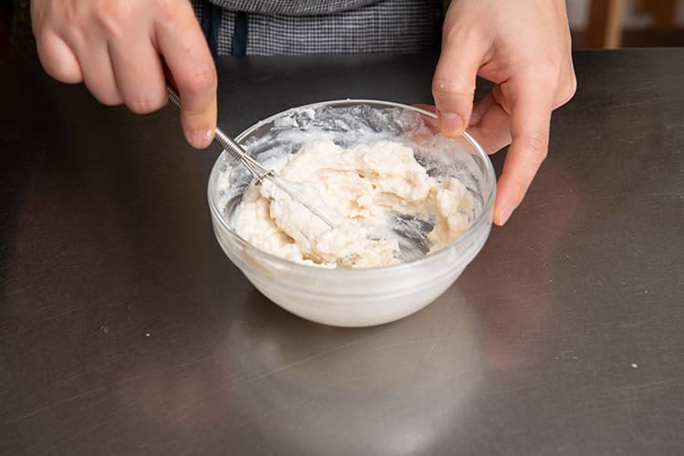「小さなかたまりが少し残っても大丈夫ですが、写真のように、おおよそなめらかに溶けるまで混ぜましょう」
