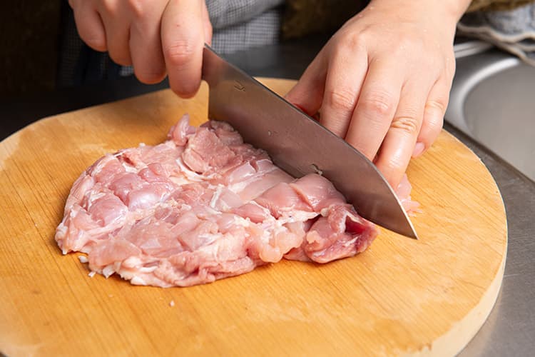 繊維を断つと、鶏肉が熱で縮みにくくなる。まな板に横長におき、2㎝程度の間隔で数カ所、切り込みを入れる。