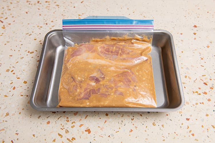 でき上がり。「鶏肉のしょうゆみりん酒粕漬け」を作るときは、全量をジッパーつき保存袋に入れておく。