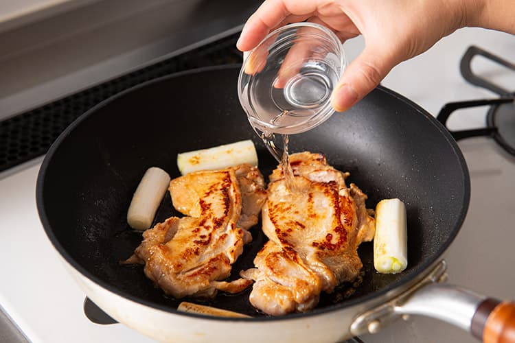 鶏肉の焦げ防止と蒸し焼きにするため、酒を回しかける。
