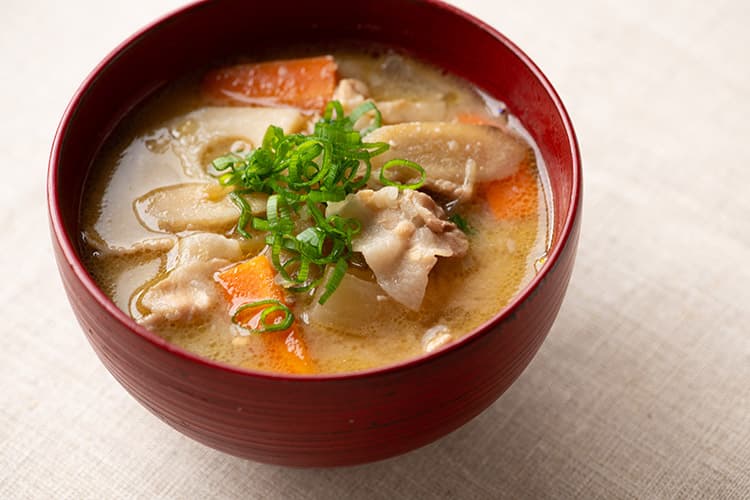 豚バラ肉、にんじん、大根、ごぼうなどの具材を、だし500mLで煮て、「しょうゆみりん酒粕」大さじ5〜6、