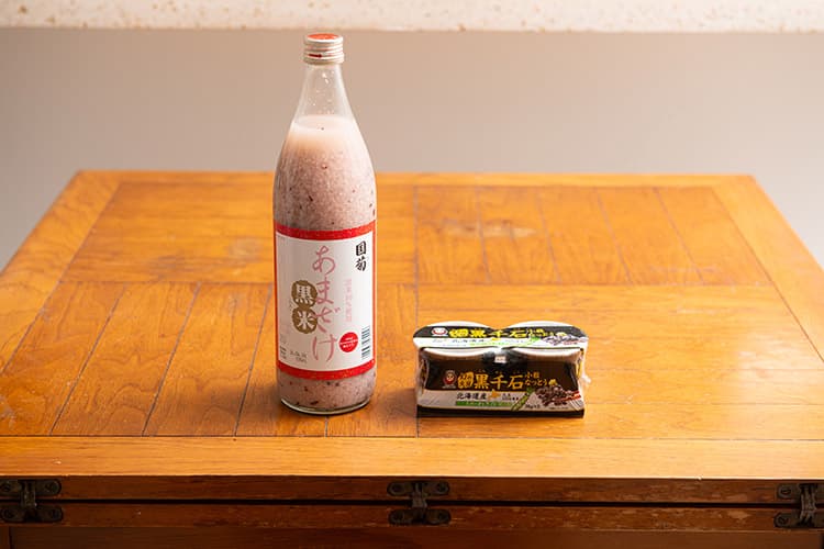 齋藤さんのお気に入り。篠崎の「国菊 黒米あまざけ」(左)は、米の10%に黒米を使用。