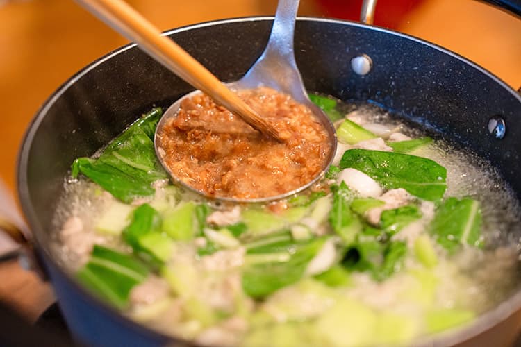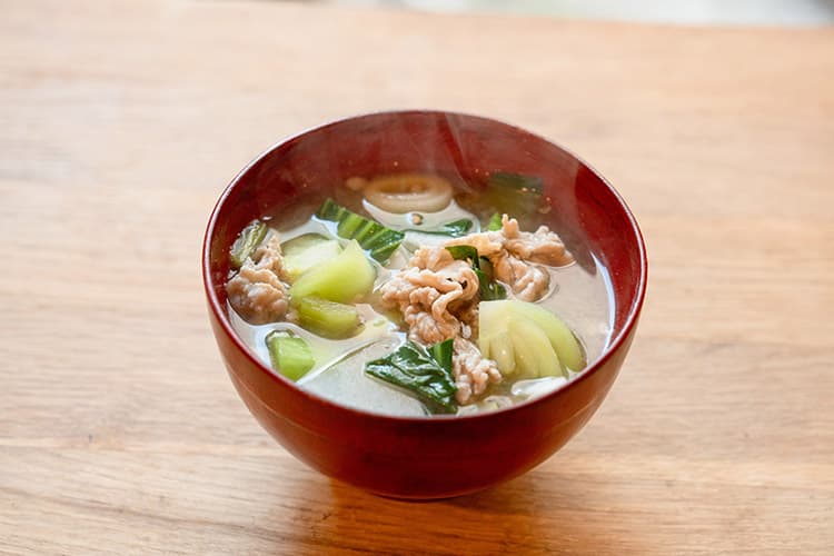 2月頃におすすめのみそ汁を作ってくれた石澤さん。豚肉を炒めてから、れんこん、大根、生姜を加え、水を加えてコトコト。チンゲンサイ、白ネギ、みそを加えてできあがりです。