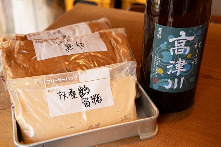 「扶桑鶴の酒粕を使っているから、合わせるお酒も扶桑鶴のものにしましょうか。酒粕にも、お酒の個性が感じられます。扶桑鶴の酒粕は、やさしくてまろやか。僕は、グラタンや豚汁に隠し味として使ったりもします。ほんのちょっとで旨みがぐっと深まりますよ」