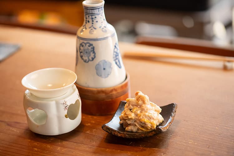 白菜漬けの酸味と旨み、酒粕のまろやかな香りがふわりと広がるあざらを一口。続いて熱燗を一口流し込めば、口のなかで酸味と甘みとが調和し、やわらかな余韻だけが残ります。