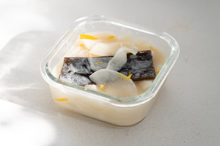 「昆布は、容器の大きさに合わせて切ってもいいですし、大根や漬け汁といっしょに混ぜて漬けても、