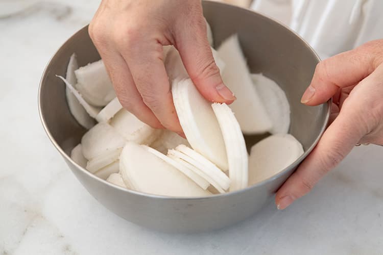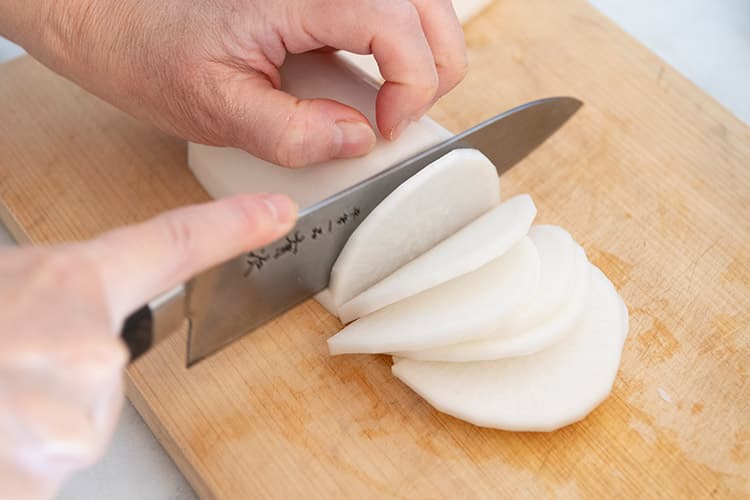 大根の厚さは、好みの食感に合わせて変えても。「薄いほど水分が出て漬かりやすく、