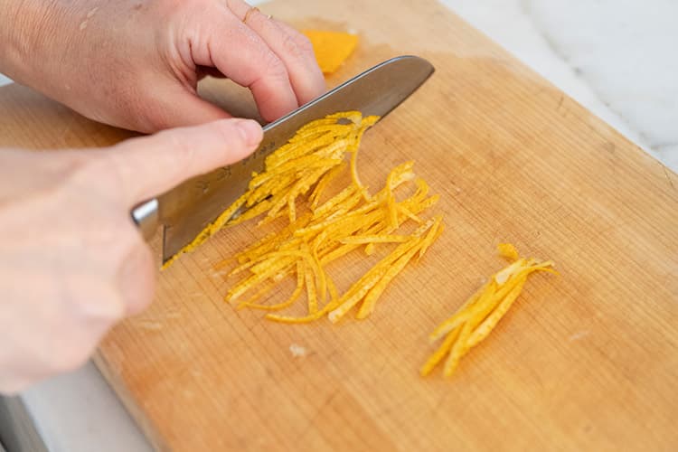 ゆずの皮は、白い部分に苦みがあるので、そいでからせん切りに(右)。