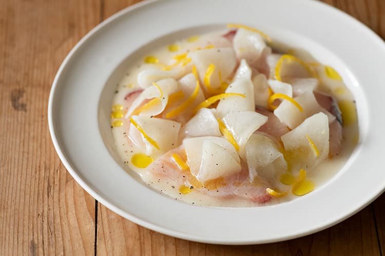 ぶりの刺し身と合わせてカルパッチョに。塩を振って水分を出したぶりの刺し身に「べったら漬け」をのせ、