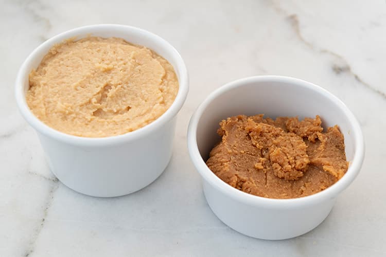 中川さんが昨年仕込んだ米味噌(右)と、仕込み立ての白味噌(左)。