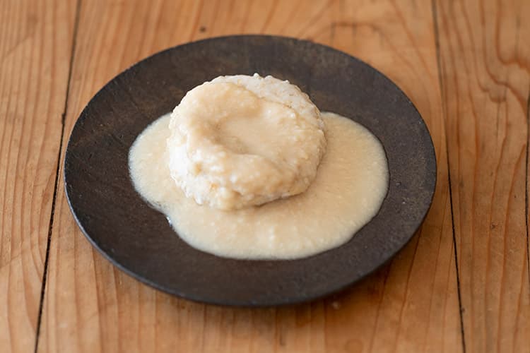 水でのばした白味噌を、焼いた玄米餅にかけて。白味噌のやさしい甘みとほのかな塩けで、上品なスイーツに。