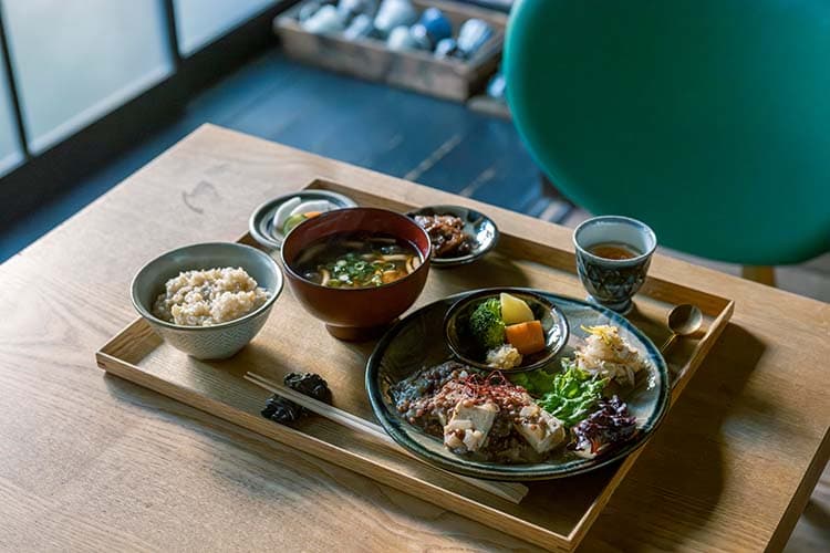 「テマヒマ」では素材にもこだわり、出汁に使う鰹節以外、動物性食材不使用で作られています。土鍋で炊いた発芽玄米に、漬物や小鉢など食べ応えのある逸品が並びます。味噌汁の味噌は米、麦、豆など3種類から選ぶことができ、1種類は月替わりなので、来店のたびに新しい味噌に出合えます。味噌は厳選して全国各地から取り寄せています。