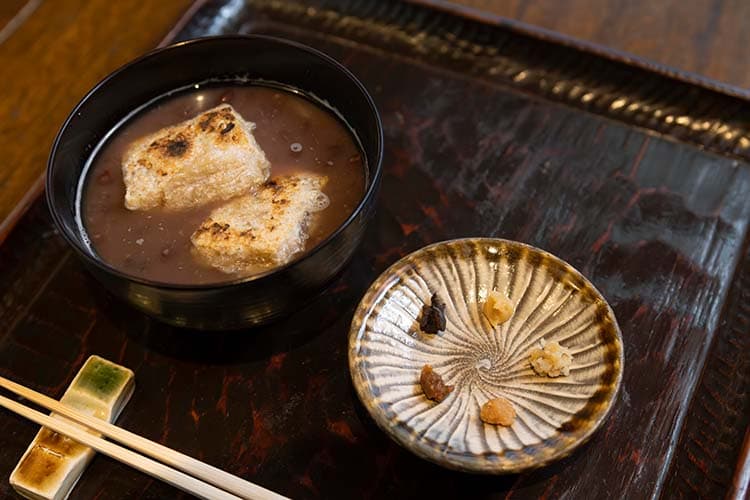 ランチメニュー以外にも、カフェタイムに提供する「ぜんざい」(冬季限定)には箸休めに塩昆布ではなく、5種類の味噌を添えるのが「テマヒマ」流。