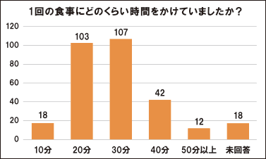寮に入る前、87%の方が1日3食の食事をし、1食につき、約20~30分かけていました。これは、調査対象の多くが家族と同居していた高校時代のことを尋ねているため、1日3食という比較的安定した食生活を送れていたものと推測できます。
