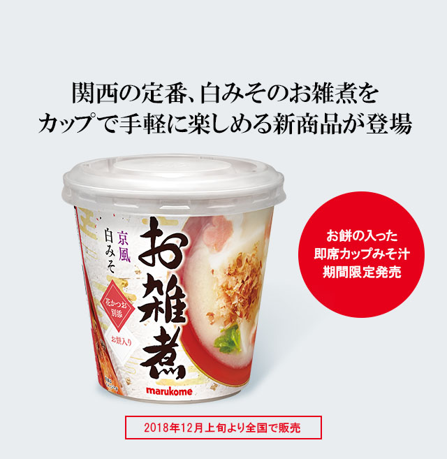 お正月のお雑煮など、白みそは京都をはじめ関西で古くから親しまれています。熟成期間が短く、米糀を多く含む白みそは、やさしい甘みとクリーミーな味わいが特徴で知名度も関西から全国へ広まりつつあります。そこで当社は温かい食べ物へのニーズが高まる冬場に合わせて、即席カップみそ汁では初となる、お餅の入った「カップ白みそ雑煮」を商品化しました。白みその味わいを試してみたい、一人分のお雑煮を手軽に楽しみたい、みそ汁より少しボリューム感のあるものが食べたいといった、さまざまなニーズにお応えする商品です。