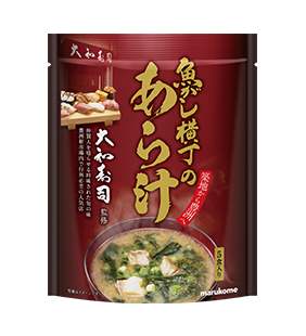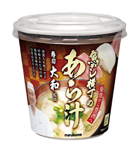 豊洲新市場に移転後も行列の絶えない人気店で、観光客はもちろん仲買人や寿司職人も通う大和寿司監修。店舗でも提供しているわかめたっぷりのあら汁で、みそには魚介系のだしを加え、具材はたら、わかめ、のり、ねぎを使用しています。