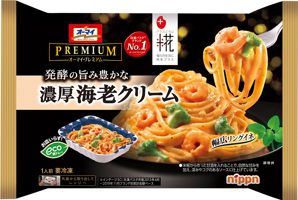 今回発売される「オーマイプレミアム 濃厚海老クリーム」には、当社の糀甘酒のほか、隠し味として赤みそが採用されました。2つの発酵食品で独特な深みとコクのある味わいを実現。海老の風味が豊かなパスタソースに仕上がっています。麺はモッチリ食感が特長のリングイネに、海老4尾とブロッコリーをトッピング。ニップンが昨秋刷新したデザイン性の高いエコ紙トレー入りです。高級感のあるパッケージには、発酵食品を取り入れた冷凍パスタであることをわかりやすく伝えるため、プラス糀のブランドロゴがあしらわれています。