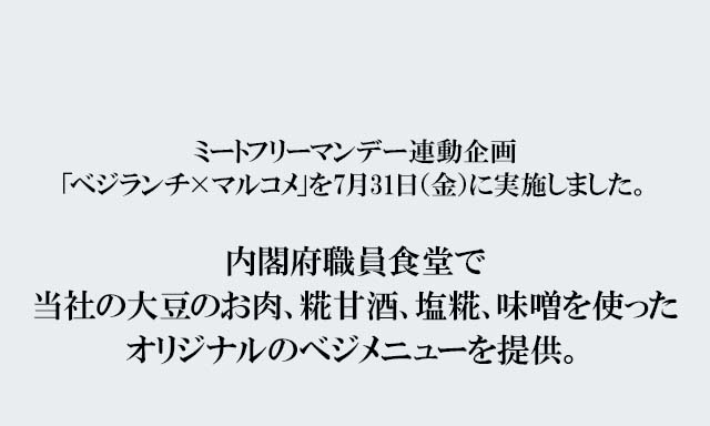 当社は味噌の主原料となる大豆に対する知見を活かして2015年に「ダイズラボ」ブランドから「大豆のお肉」シリーズを発売しました。「大豆のお肉」はヴィーガンやベジタリアンの方の食材としてだけではなく、カロリーや脂質が低いという健康面のメリットが、お肉好きの方からも注目されています。また、信州味噌に欠かせない米糀からつくる糀甘酒は砂糖代わりの発酵甘味料として料理やスイーツに使える点が白砂糖を避ける方からも注目されています。「ベジタリアン・ヴィーガン食の普及」を推進する内閣府職員食堂では、“週に一度だけ菜食を実践する“という趣旨で、 2017年3月から毎週金曜日に「ベジメニュー」の提供が開始されています。現在では、週2回、一日60食の動物性食品を使用しないベジメニューが提供されています。そのような中、当社が賛助企業として参画する団体、ミートフリーマンデーオールジャパンからの呼びかけで、同食堂で当社商品を使ったベジメニューを提供する1日限定の催し「ベジランチ×マルコメ」を7月31日(金)に実施しました。当日は、食堂を運営する株式会社ニッコクトラストより、「大豆のお肉のスタミナ丼」「ブロッコリーの塩糀オイル蒸し」「糀甘酒のブラマンジェ」「みそ汁」の計4品が提供されました。