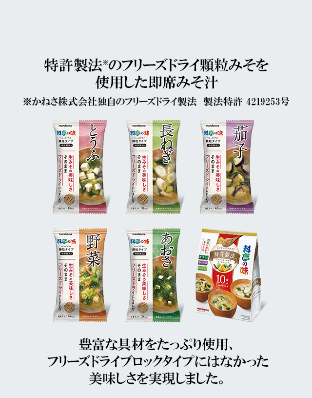 生みそをそのままフリーズドライする特許製法を用いた顆粒みそは、みそ汁を作ってからフリーズドライするブロックタイプのみそ汁より加熱時間が短いため、鮮度が良く、生みその味と香りをそのまま楽しめます。また、みそと具材を別々に加工するため、素材本来のおいしさや色あいを保った具材を味わうことができます。