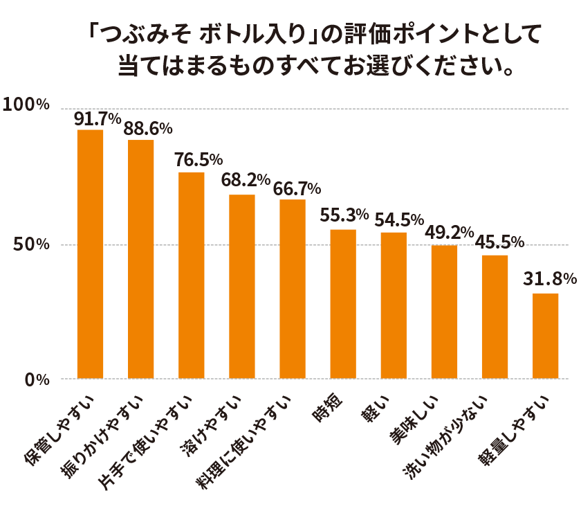 アンケートの結果、生みその用途は98%が「みそ汁」でした。一方、つぶみその用途は「炒め物」が81%、「隠し味・コクだし」が74%、「和え物」が62%、「サラダ」が54%と、料理使いでつぶみそが生みそを大きく超えました。評価ポイントは「保管しやすい」が92%、「振りかけやすい」が89%、「片手で使いやすい」が77%の順に多く、「溶けやすい」が68%、「料理に使いやすい」が67%と簡便性が高く評価されました。また、今回のボトルタイプをどの程度、家族や友人にすすめたいか」を尋ねた他者推奨意向(NPS®)の値は発売前にもかかわらず21となりました。