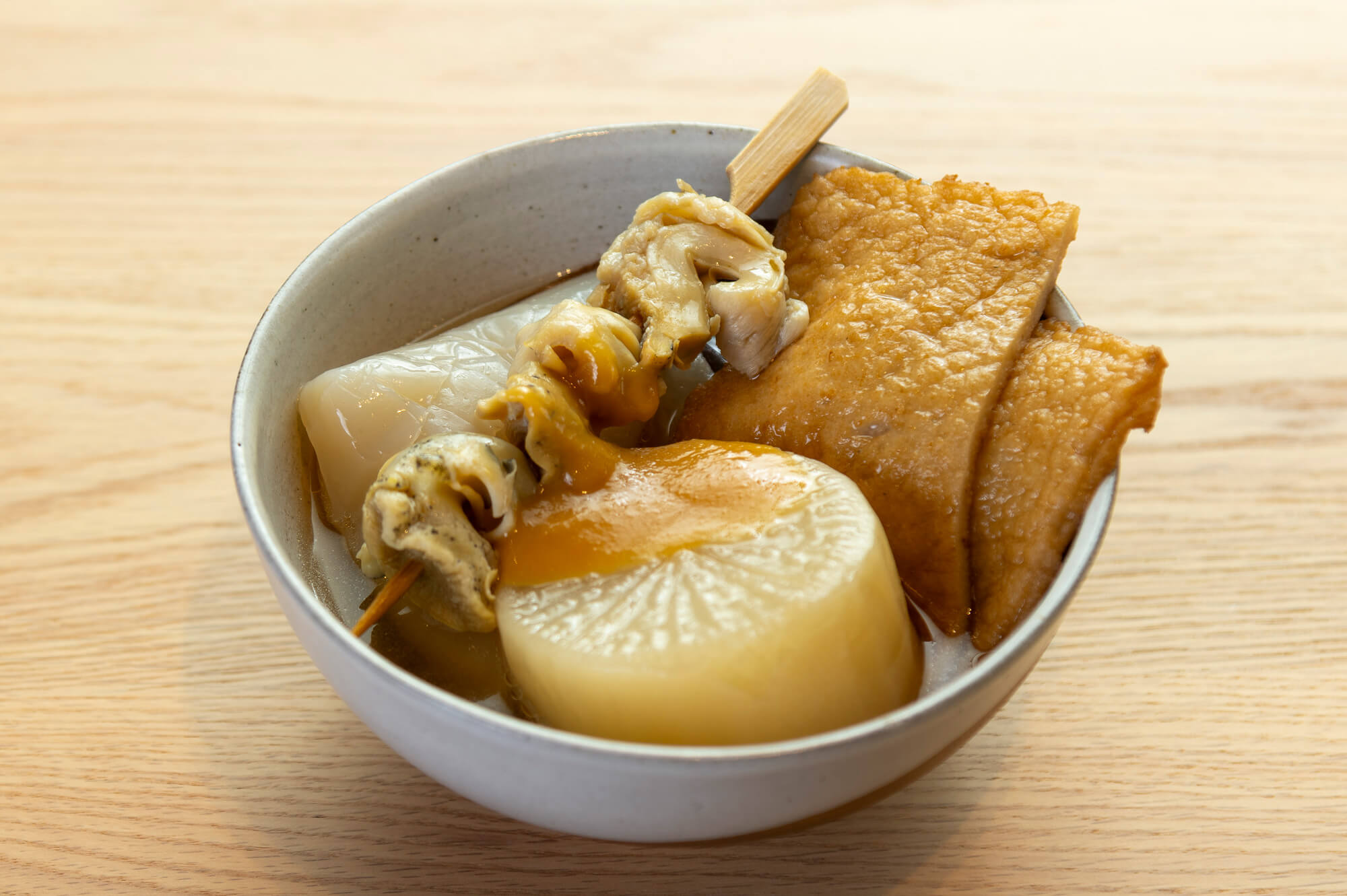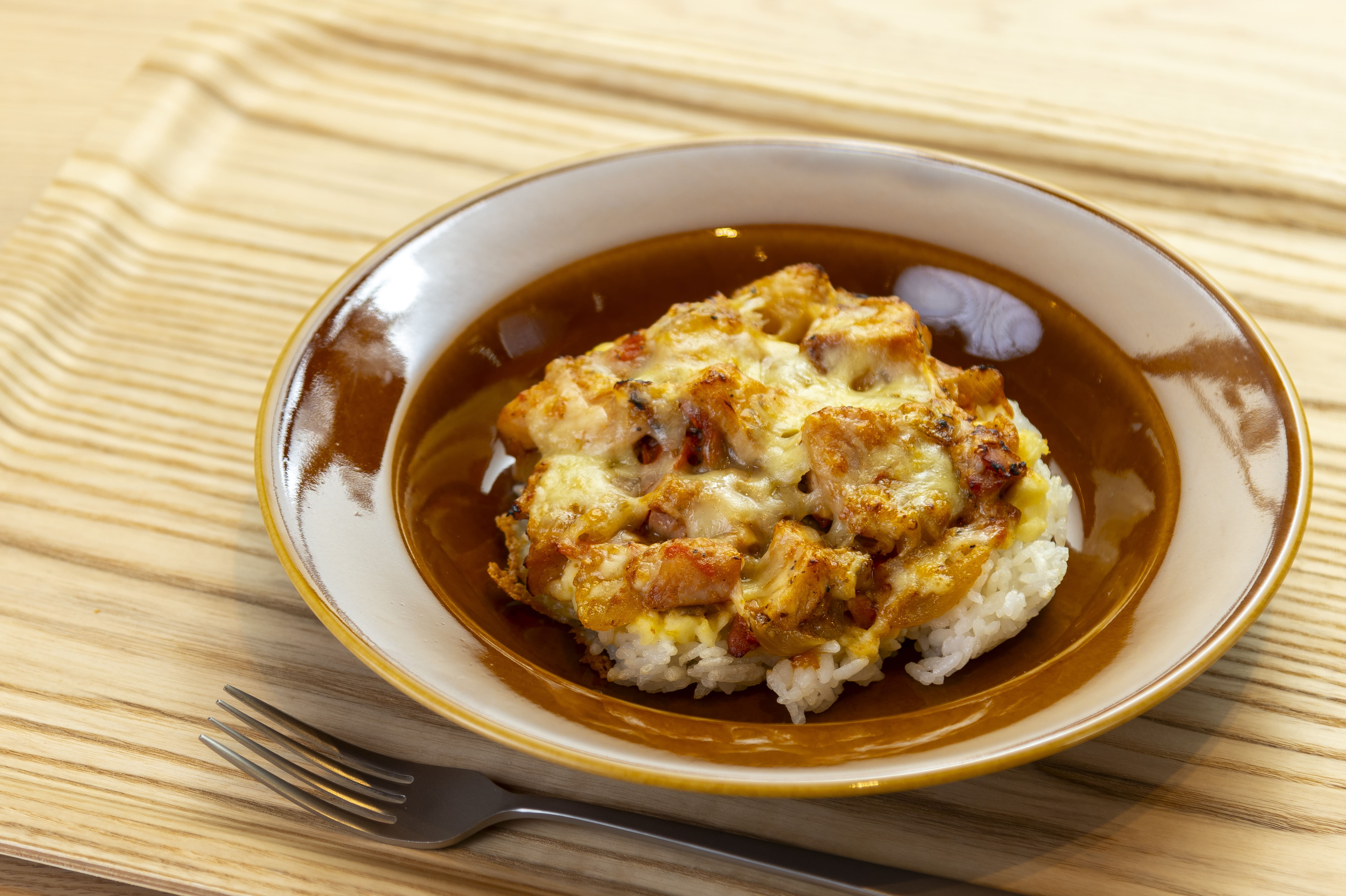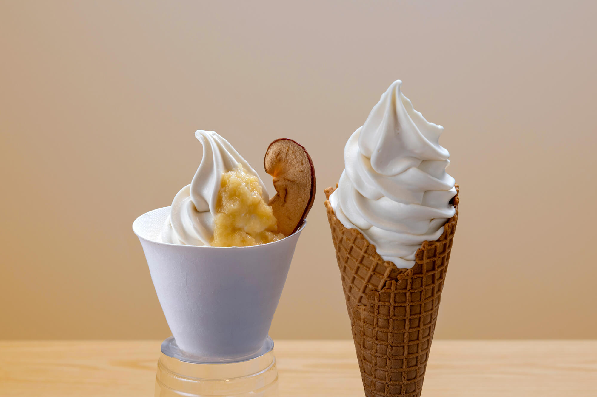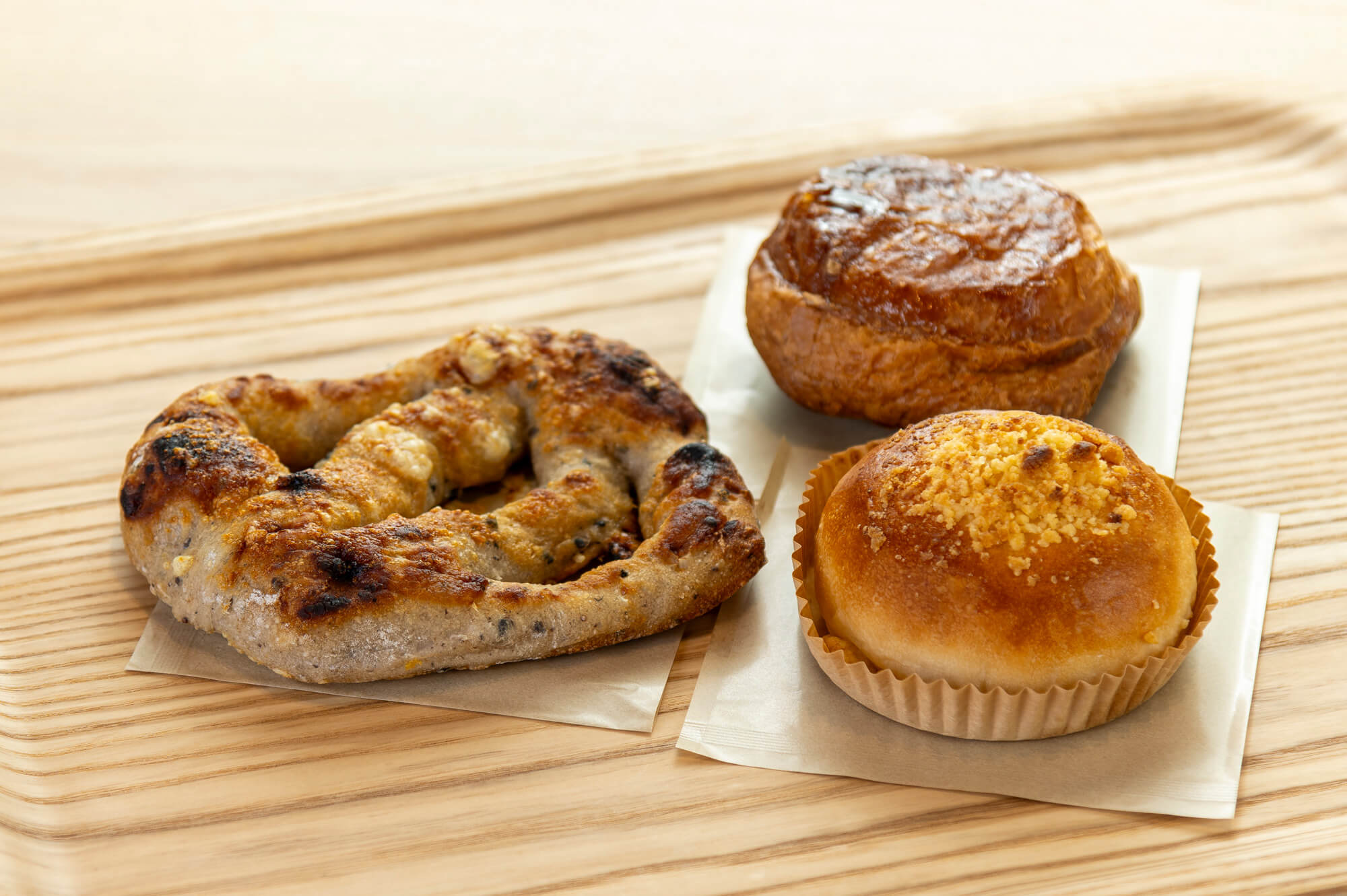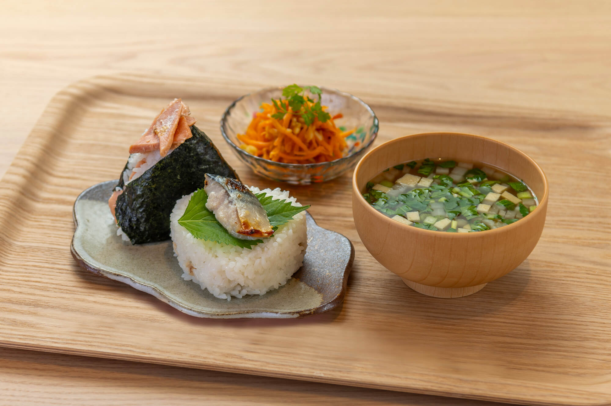 背景に梵珠山(ぼんじゅさん)を望む館内のBONJU CAFEでは、地元青森の食材にこだわったメニューもご用意しています。おにぎり1個と小鉢、みそ汁がセットになった「おにぎりセット」(750円~)のほか、青森名物の「しょうがみそおでん」(各100円~)も。こだわりの糀パンは、「つぶみそアップルあんパン」「しょうがみその雑穀フーガス」「アップルクイニーアマン」をラインアップ。さらに、青森好きでも有名な料理家の栗原心平氏が監修したオリジナルメニュー「生しょうゆ糀のチキントマトドリア」(1,000円)を楽しむことができます。