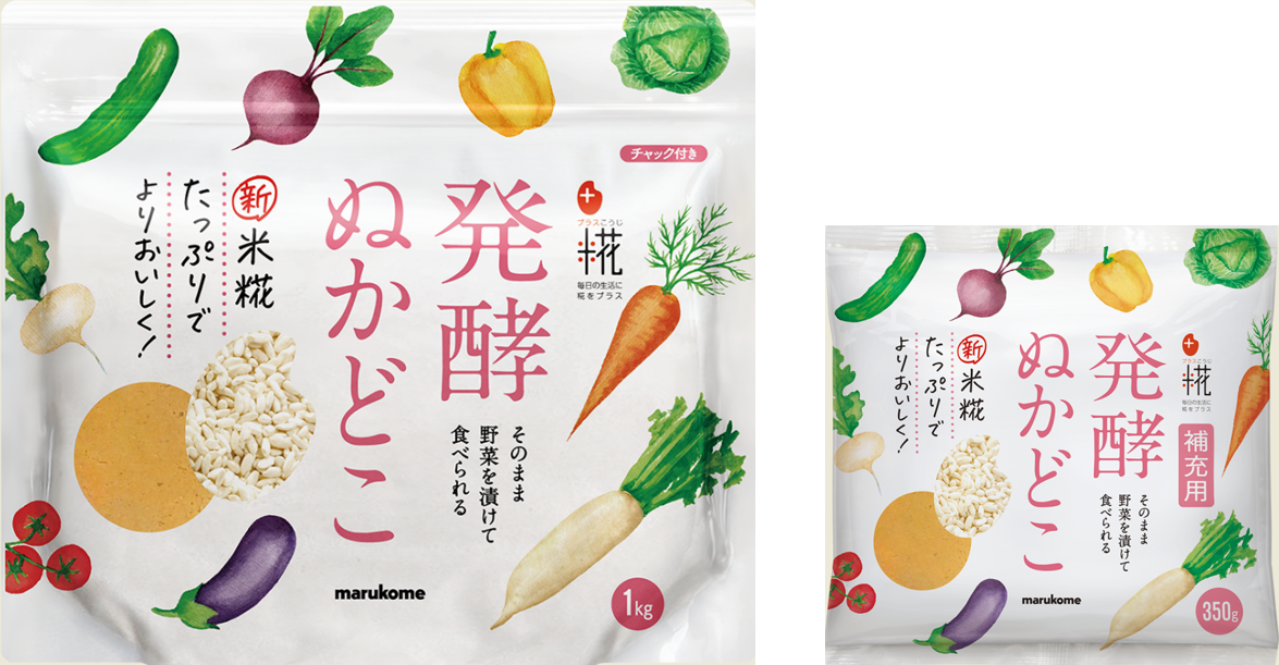 「プラス糀 発酵ぬかどこ」は1回あたりの野菜の漬け込み量200gでご使用回数4~5回を目安としていますが、ぬかどこが減ってきたり柔らかくなってきたりしたときの「プラス糀 発酵ぬかどこ補充用」もリニューアル。ぬかどこの余分な水分をペーパータオルなどで吸いとり、同商品と食塩大さじ1~2杯程度をお好みで加えて混ぜ合わせると、ぬかどこを継続して使用できます。